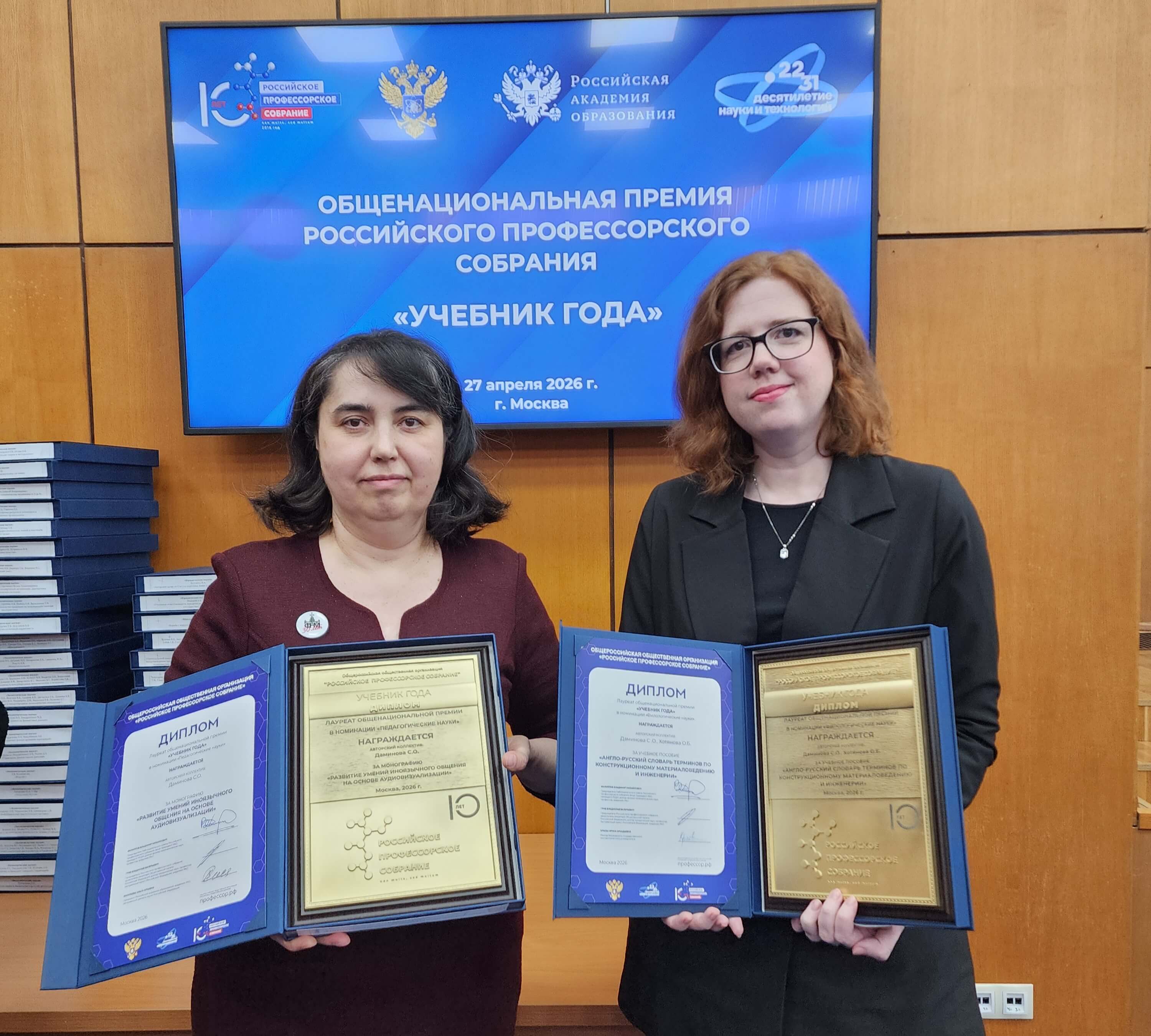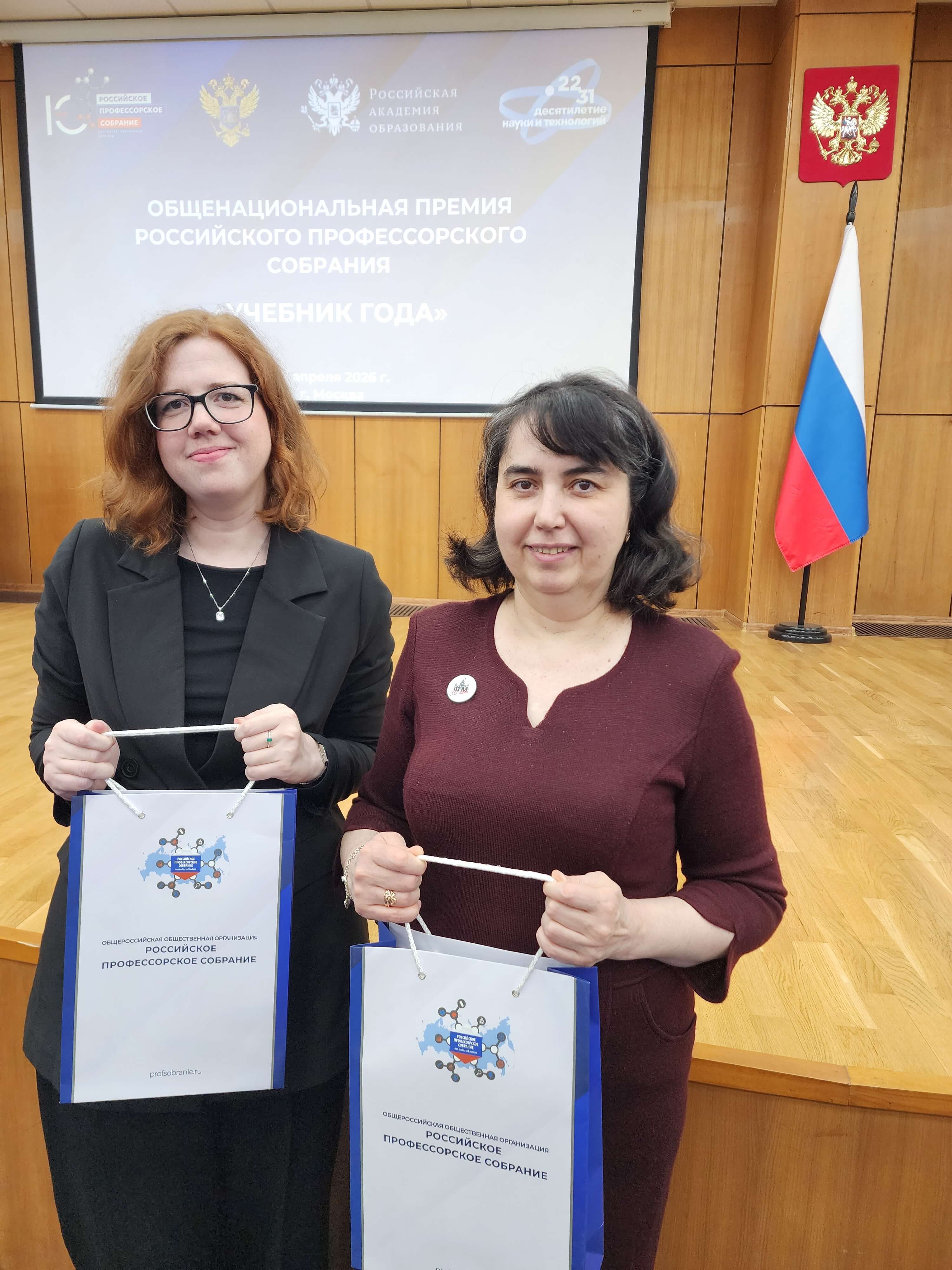 27 апреля в Российской академии образования состоялась церемония награждения победителей общенациональной премии Российского профессорского собрания «Учебник года». В конкурсе приняли участие авторы более 500 учебников, учебных пособий и монографий из 200 учебных и научных заведений России. Лучшие работы были выбраны жюри, состоящим из 2000 экспертов.